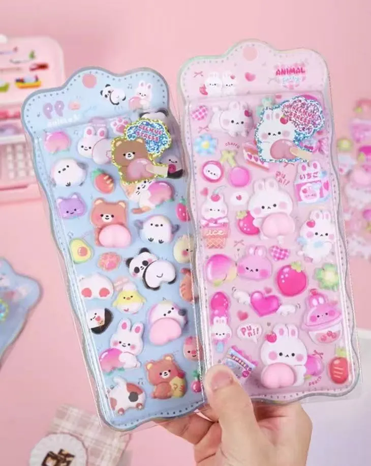 3D डिझाईन : सपाट स्टिकर्सच्या विपरीत, यामध्ये उंचावलेला, फुगीर पोत असतो ज्यामुळे पृष्ठभागांवर एक खेळकर, मितीय स्वरूप निर्माण होते.
