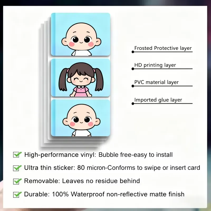क्रेडिट कार्डची त्वचा सामान्यतः PVC प्लास्टिक सारख्या सामग्रीपासून बनविली जाते, जी पातळ, पेस्ट करण्यास आणि काढण्यास सोपी असते आणि टिकाऊपणा आणि दीर्घकाळ टिकणारा देखावा सुनिश्चित करण्यासाठी बऱ्याचदा वॉटरप्रूफ आणि स्क्रॅच-प्रतिरोधक मॅट पृष्ठभाग असते. ते जलरोधक, अश्रु-प्रतिरोधक आणि उच्च-रिझोल्यूशन यूव्ही प्रिंटिंगशी सुसंगत असते.