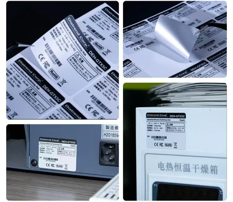 PET पांढरा/मॅट सिल्व्हर: 150℃ पर्यंत उष्णता-प्रतिरोधक, घरगुती उपकरणे आणि पॉवर अडॅप्टरवरील नेमप्लेट्ससाठी योग्य.