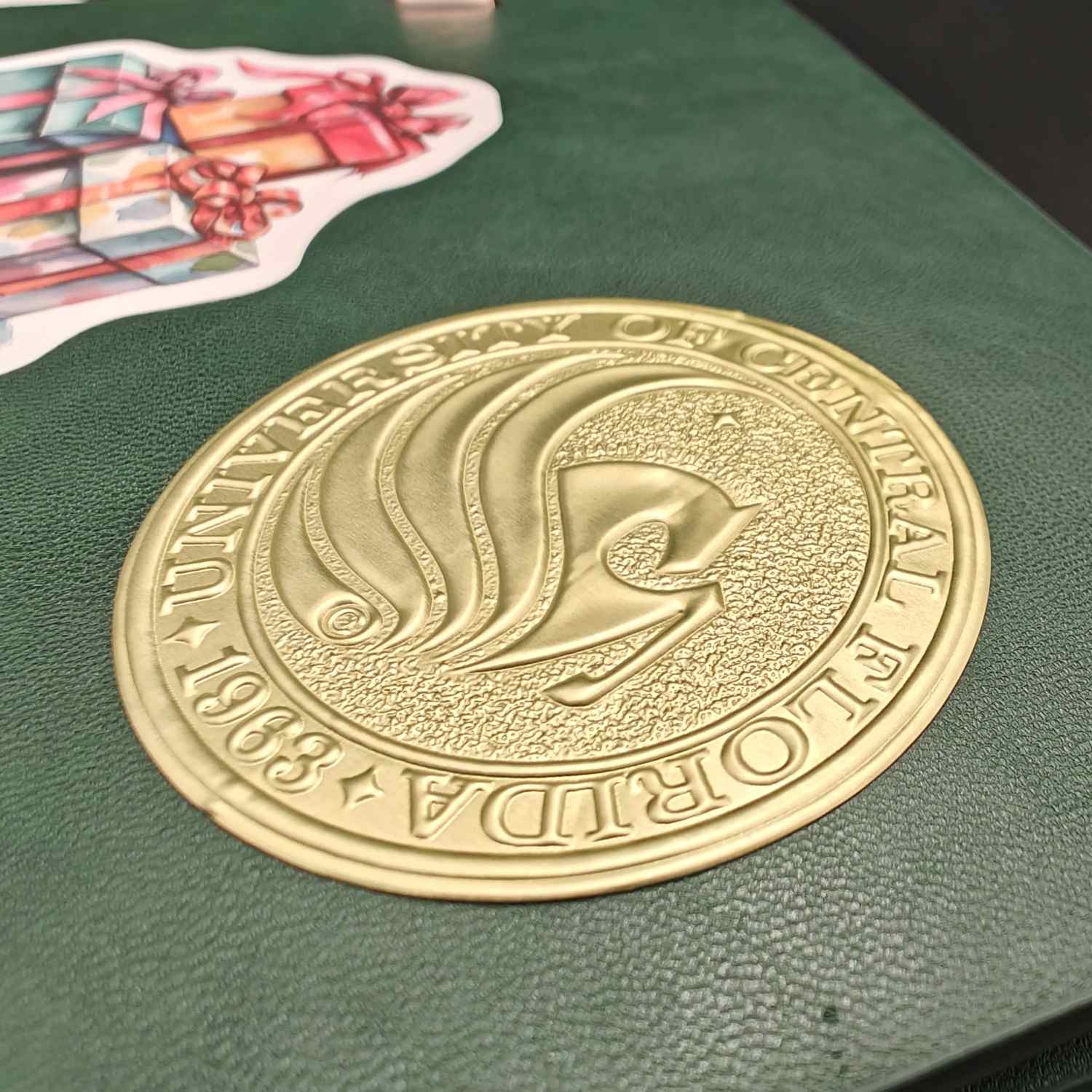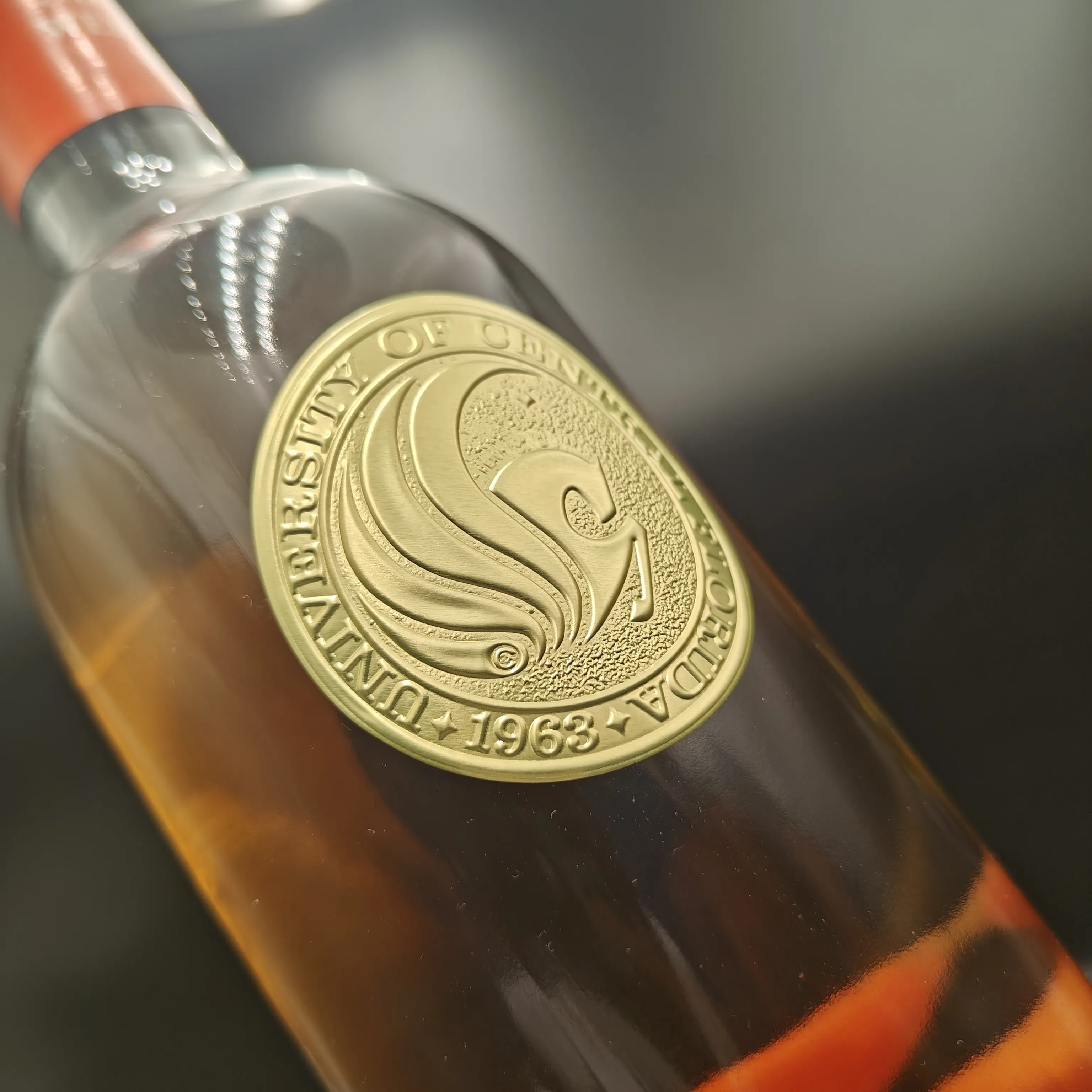 गोलाकार फॉइल एम्बॉस्ड वाइन लेबले हे गोलाकार बेस असलेले सेल्फ-ॲडेसिव्ह लेबल आहे, जेथे हॉट स्टॅम्पिंग तंत्रज्ञानाद्वारे मेटॅलिक फॉइल सामग्रीच्या पृष्ठभागावर हस्तांतरित केले जाते आणि नंतर नक्षीदार नमुने अंतर्गोल-कन्व्हेक्स मोल्ड्स वापरून दाबले जातात. लघुपदकाप्रमाणेच, लेबलची धातूची चमक आणि त्रिमितीय स्पर्श भावना बाटलीच्या शरीरावर हळुवारपणे चिकटवल्यानंतर वाइनच्या संपूर्ण बाटलीची प्रीमियम भावना त्वरित वाढवू शकते.