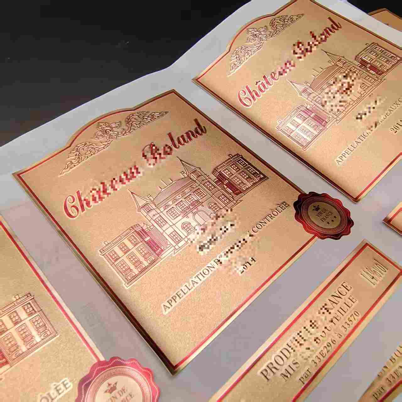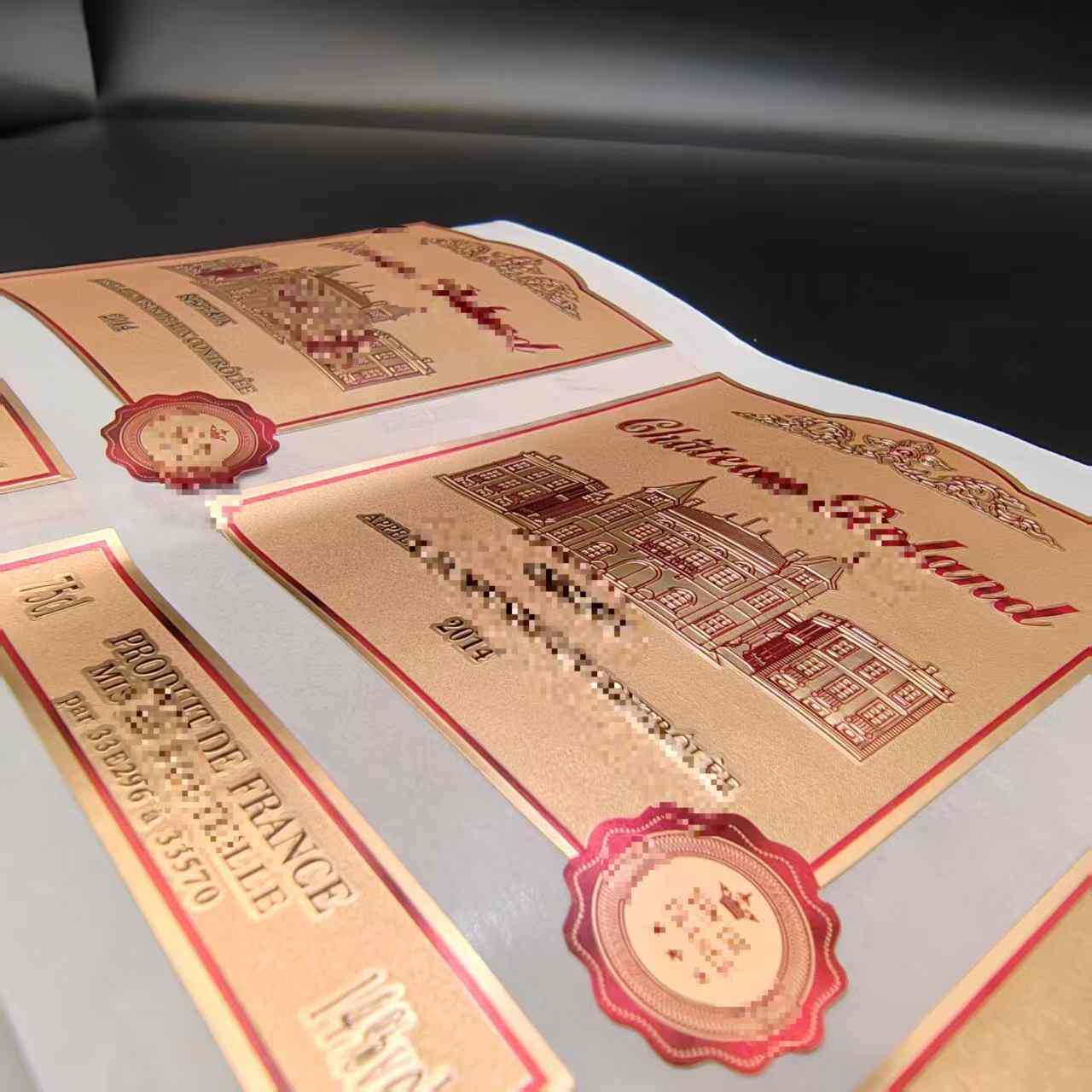 वाईन बाटलीचे स्टिकर्स उच्च-गुणवत्तेच्या पीव्हीसी सामग्रीचे बनलेले आहेत, सानुकूल पीव्हीसी वॉटरप्रूफ गिल्डेड वाइन लेबल्समध्ये उत्कृष्ट पाणी आणि आर्द्रता प्रतिरोधक आहे.
